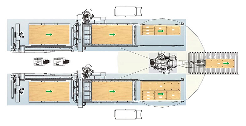 Обрабатывающий центр NCG2512L AL+UL (Нестинг) с функцией нанесения этикеток→авто загрузка→авто выгрузка с помощью высокоэффективного робота обеспечивают непрерывную работу без пауз для достижения максимальной эффективности процесса раскроя.