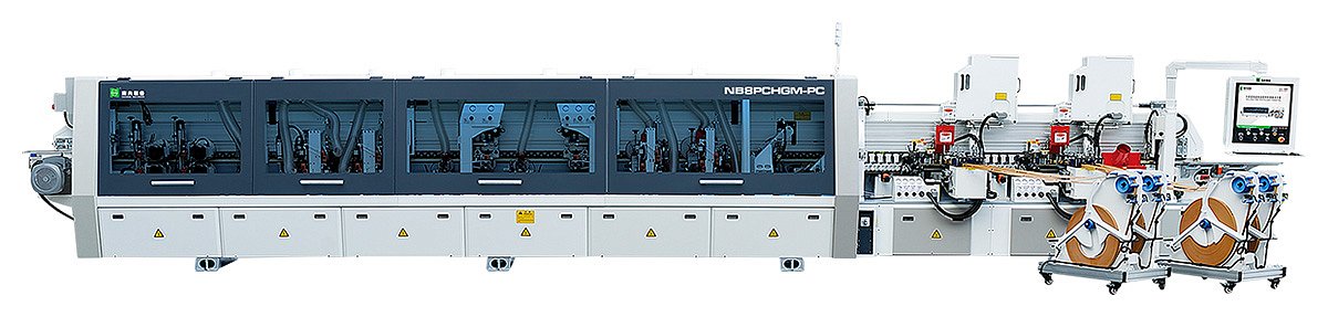 Кромкооблицовочный станок NB8PCHGM-PC предназначен для облицовывания прямолинейных кромок плитных материалов рулонными кромками АБС, ПВХ и полосовым кромочным материалом толщиной до 3 мм.
